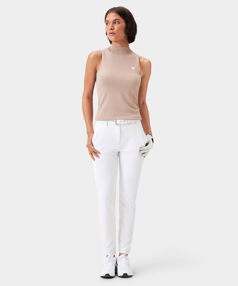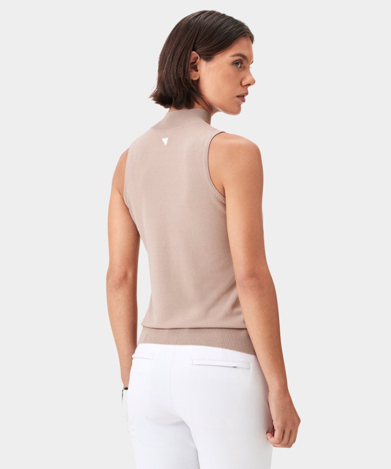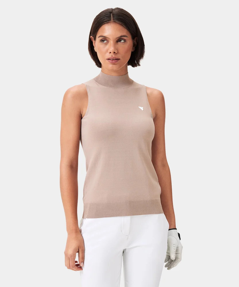 Tento bezrukávový top je ušitý ze strečového materiálu. Má sportovní vysoký mock neck, přiléhavý střih a lichotivé žebrované zakončení v pase.