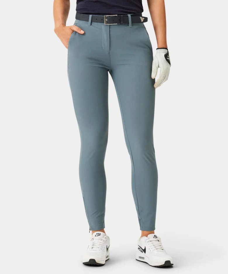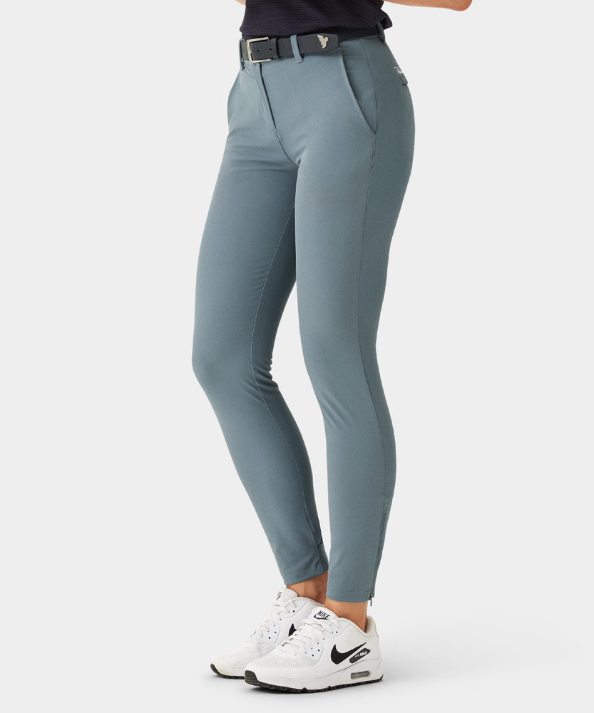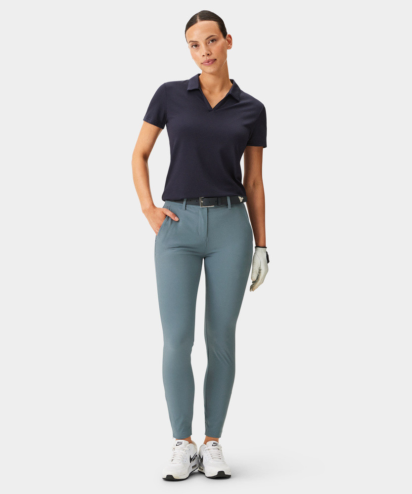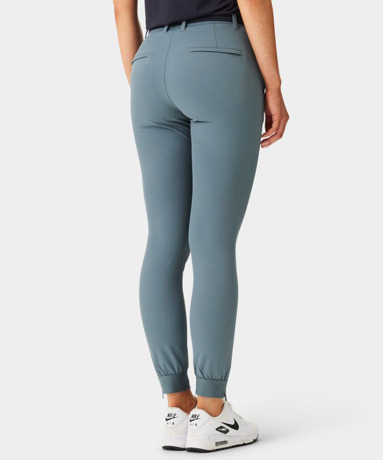 Joggery jsou ušity z lehkého čtyřsměrně strečového materiálu, který umožňuje maximální volnost pohybu. Žebrované manžety na kotnících jsou doplněny zipem pro snadné oblékání a elastický pas má protiskluzové silikonové lemování, které udrží tričko úhledně na místě. Perfektní sportovní alternativa ke klasickým golfovým kalhotám.